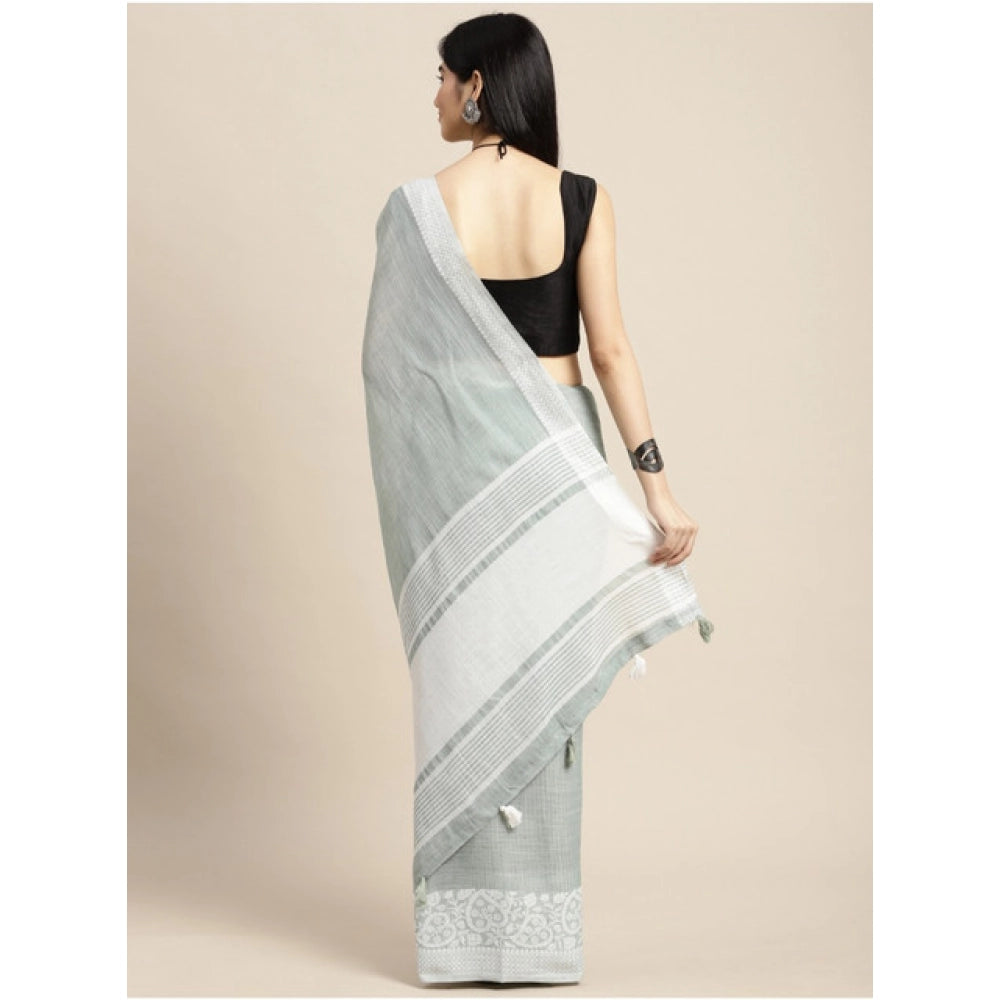 Generic Women's Linen Printed Saree With Unstitched Blouse 5.5Mtr (Sea Green)