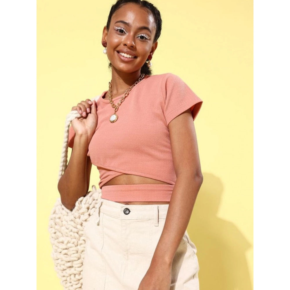 Color: Pink, Material: Polyester Lycra Pattern: Solid, Neck Type: Round Neck, Sleeve Type: Short Sleeve Length Type: Hip Length, Type:Women's Top