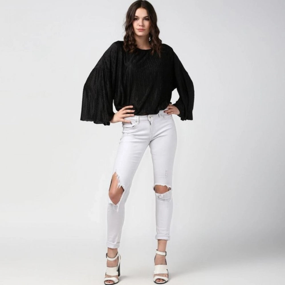 Color: Black, Material: Polyester Pattern: Pleated, Neck Type: Round Neck, Sleeve Type: Balloon Sleeve Length Type: Hip Length, Type:Women's Top